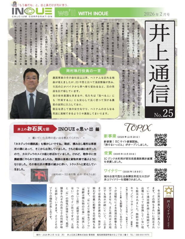 「井上通信No.25」2026年2月号を発行しました 「井上通信No.25」2026年2月号発行 次号は4月15日(水)発行予定です。どうぞお楽しみに! 【詳しくは下記のPDFファイルをご覧ください。】 井上通信2026年2月号